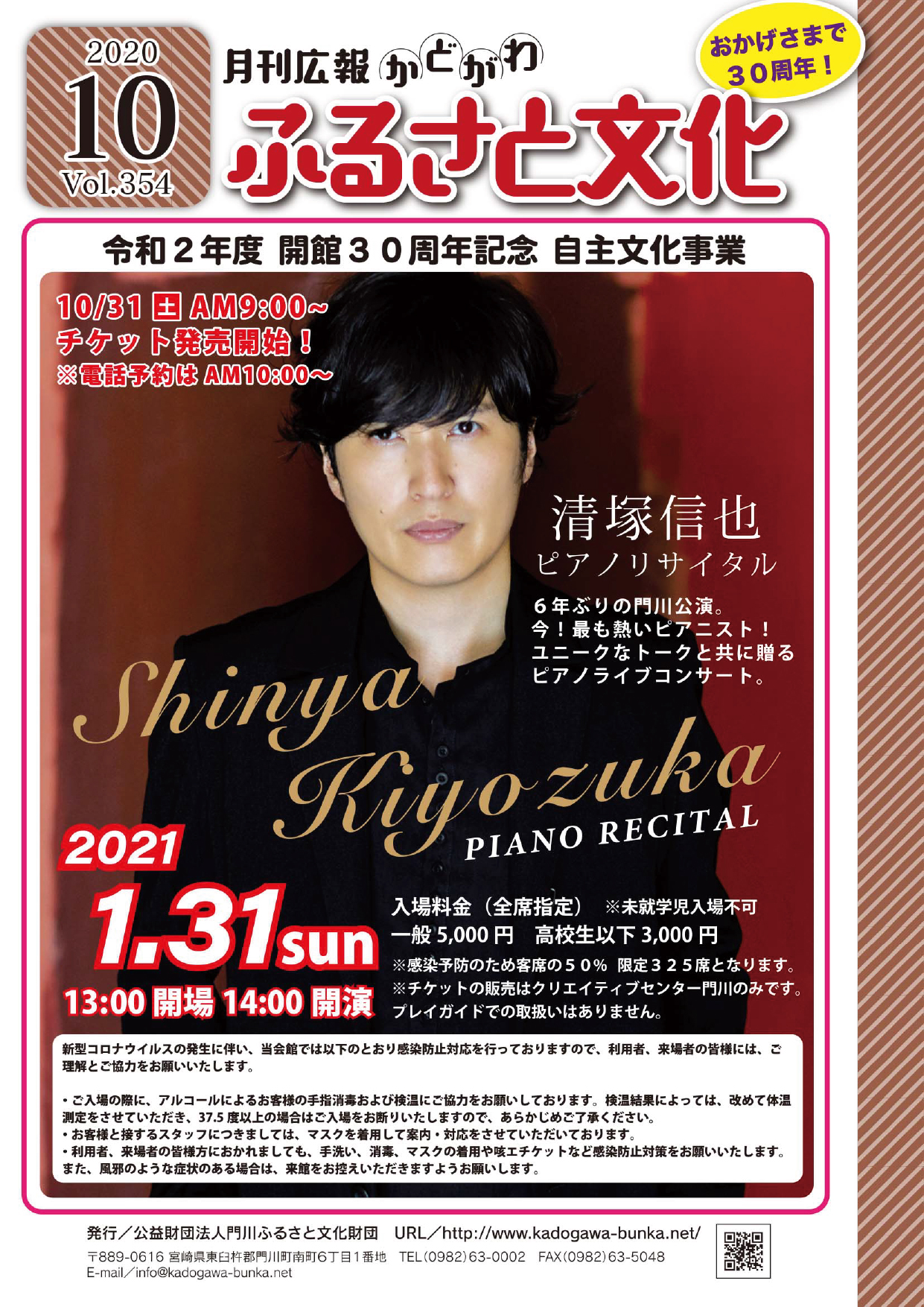 広報「ふるさと文化」10月号を発行しました。今月号も6年ぶりの門川公演となるピアニスト清塚信也ピアノリサイタルのご案内および、各公演延期のお知らせです。