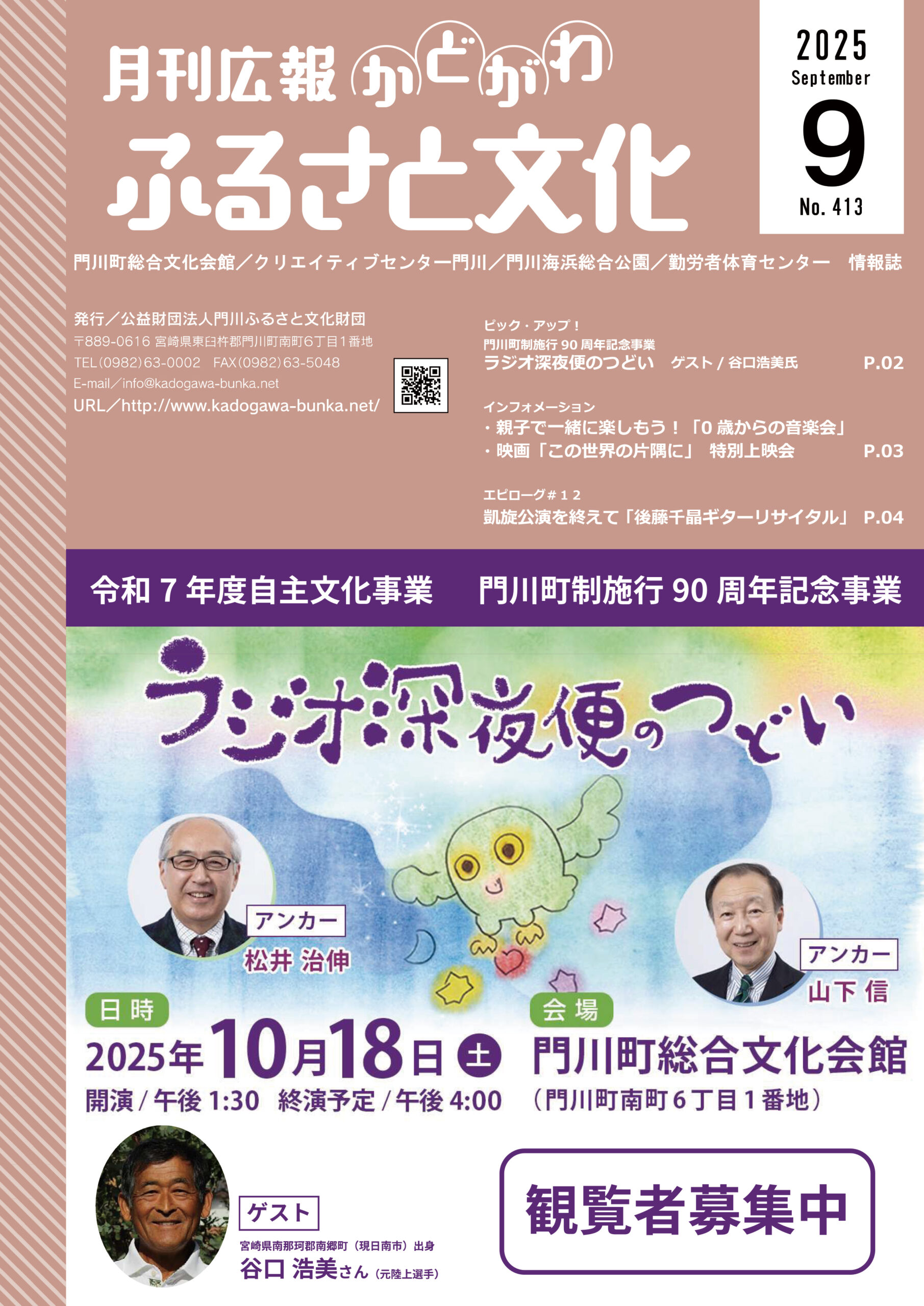 広報「ふるさと文化」9月号を発行しました。今月号は10月に開催する「ラジオ深夜便のつどい」のご案内と、9月に開催する映画「この世界の片隅に」、「ジャズと遊ぼう!コンサート 0歳からの音楽会」についてのご案内です。広報「ふるさと文化」は門川町内の各ご家庭に配布。その他、日向市・延岡市の図書館や行政窓口などに置いております。どうぞお手にとってご覧ください。