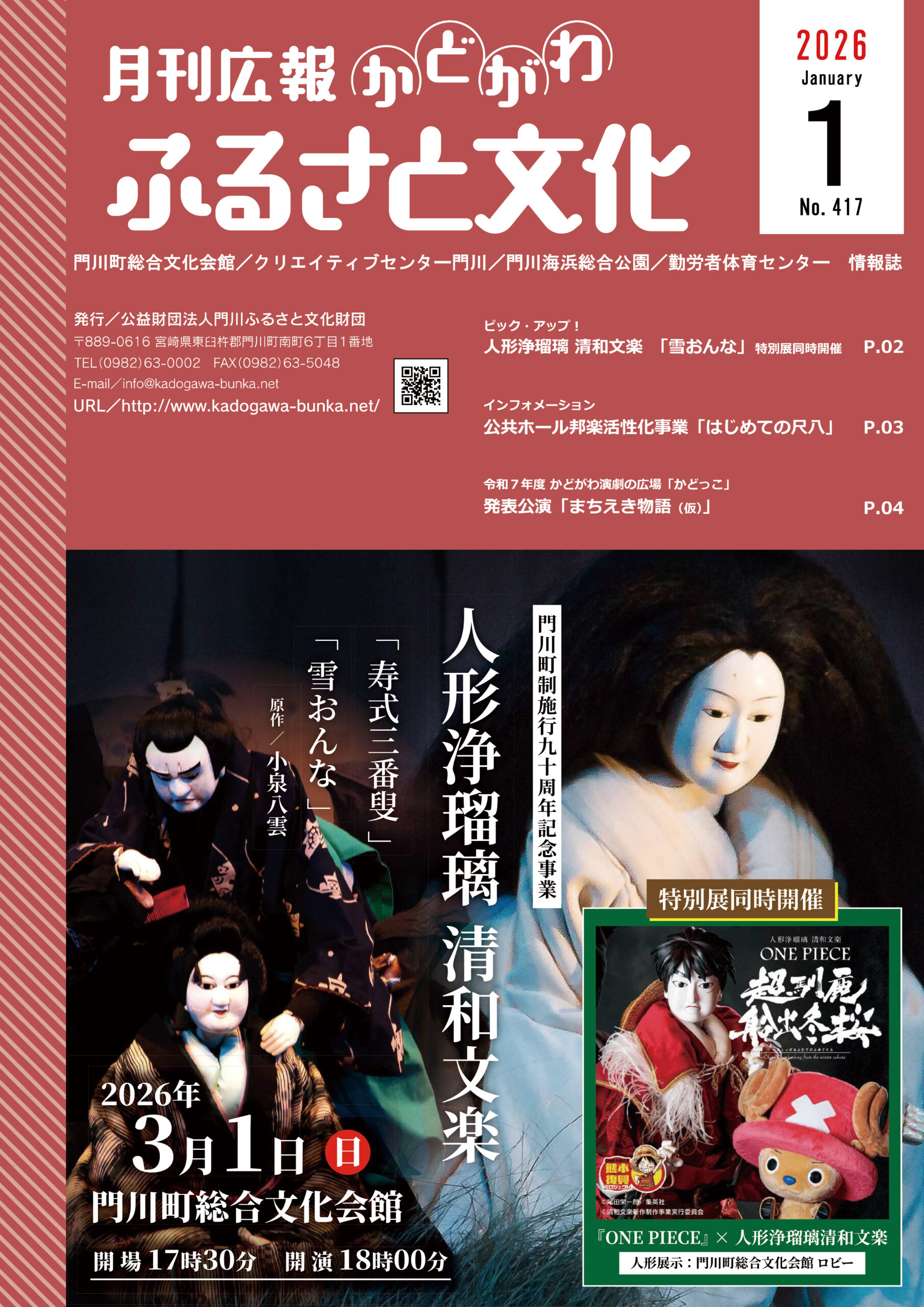 広報「ふるさと文化」1月号を発行しました。今月号は3月に開催する「人形浄瑠璃 清和文楽」のご案内と、「公共ホール邦楽活性化事業 はじめての尺八」のご案内です。広報「ふるさと文化」は門川町内の各ご家庭に配布。その他、日向市・延岡市の図書館や行政窓口などに置いております。どうぞお手にとってご覧ください。