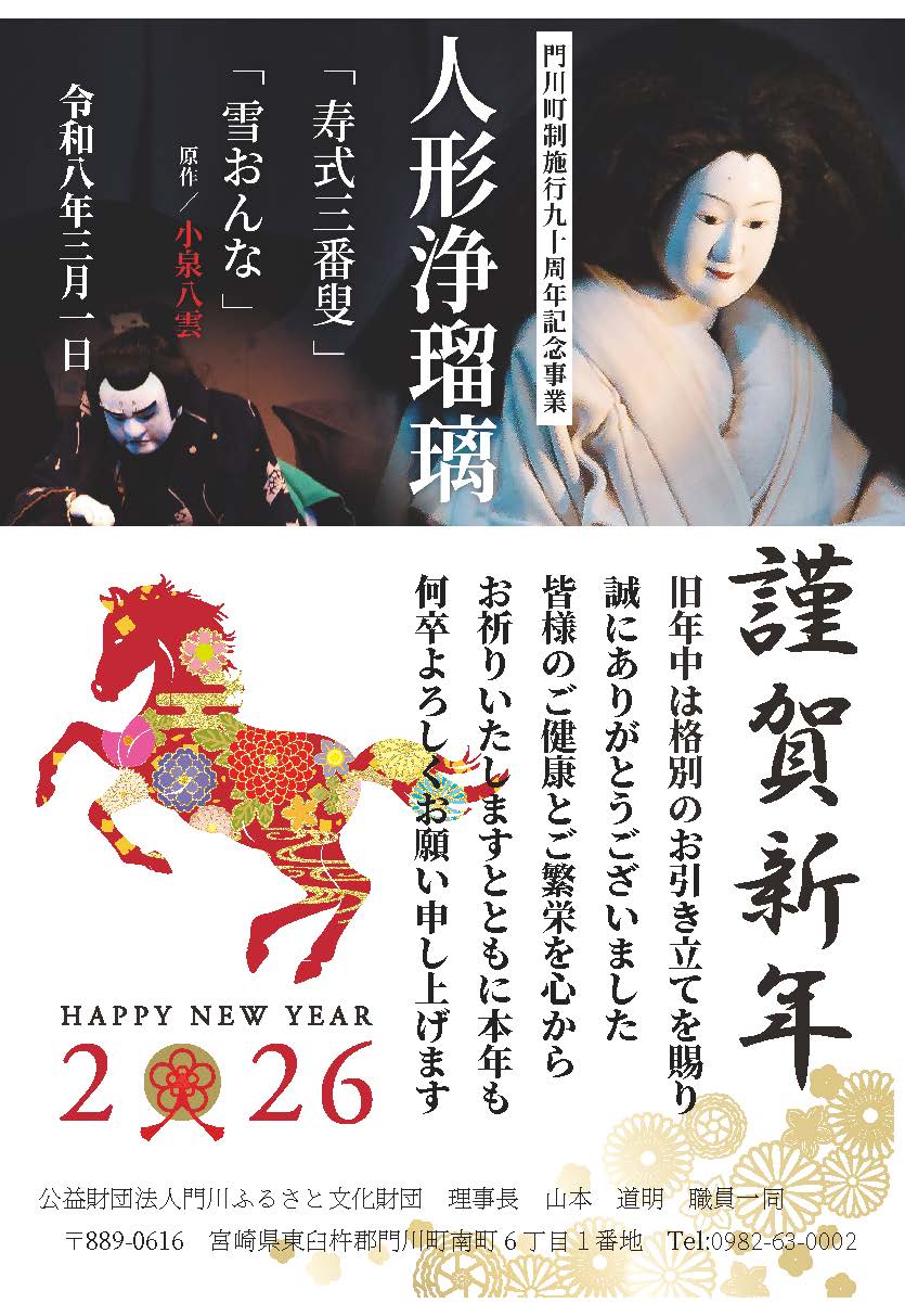 謹賀新年 Posted By kadogawa-bunka on 2026年1月1日 謹んで新春の祝詞を申し上げます。 昨年は格別なご高配を賜り厚く御礼申し上げます。 本年も芸術文化・スポーツ事業の展開に努めて まいりますので一層のご愛顧をお願い申し上げます。 公益財団法人門川ふるさと文化財団 理事長 山本 道明 職員一同