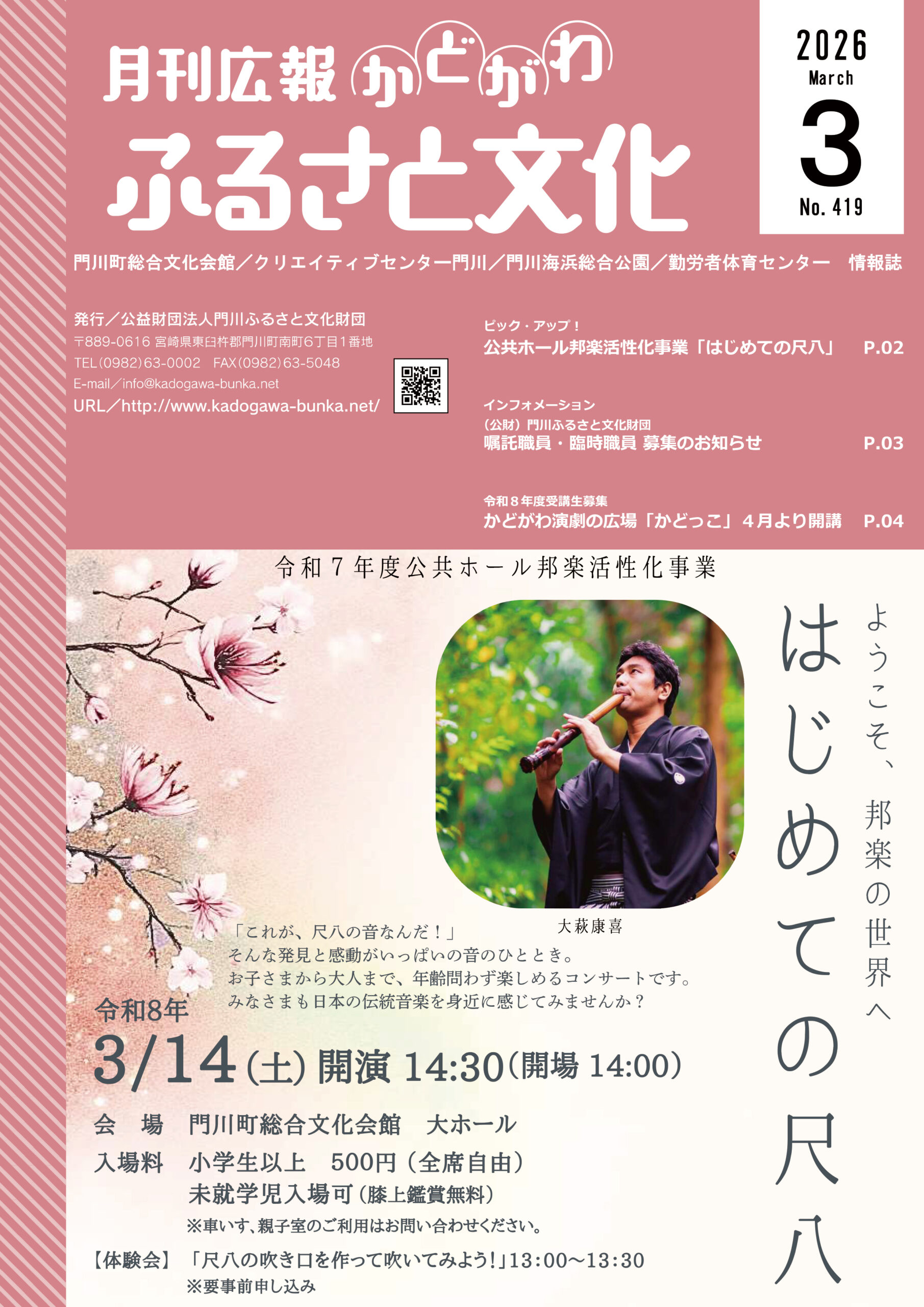 広報「ふるさと文化」3月号を発行しました。今月号は3月に開催する「公共ホール邦楽活性化事業 はじめての尺八」と「(公財)門川ふるさと文化財団職員募集」のご案内です。広報「ふるさと文化」は門川町内の各ご家庭に配布。その他、日向市・延岡市の図書館や行政窓口などに置いております。どうぞお手にとってご覧ください。