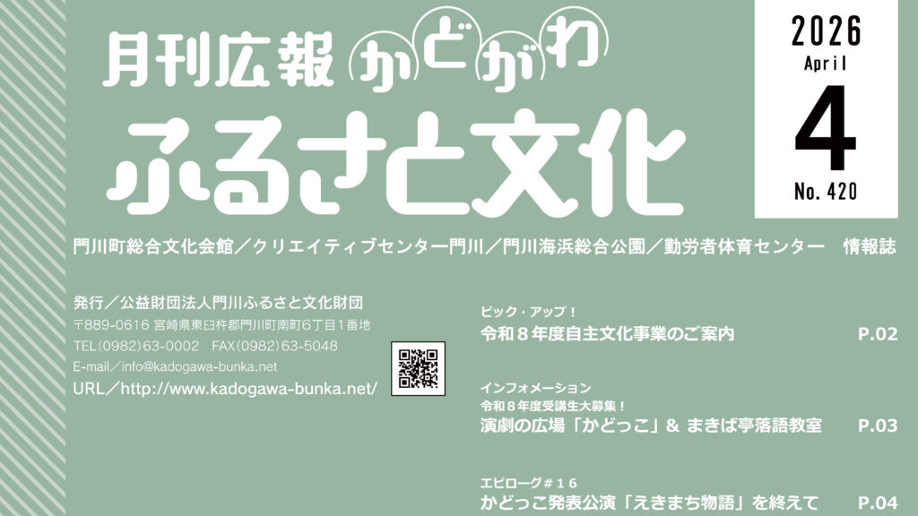 広報「ふるさと文化」4月号は、令和8年度自主文化事業ラインナップのご紹介と、令和8年度「かどがわ演劇の広場かどっこ」「まきば亭落語教室」受講生募集のご案内です。