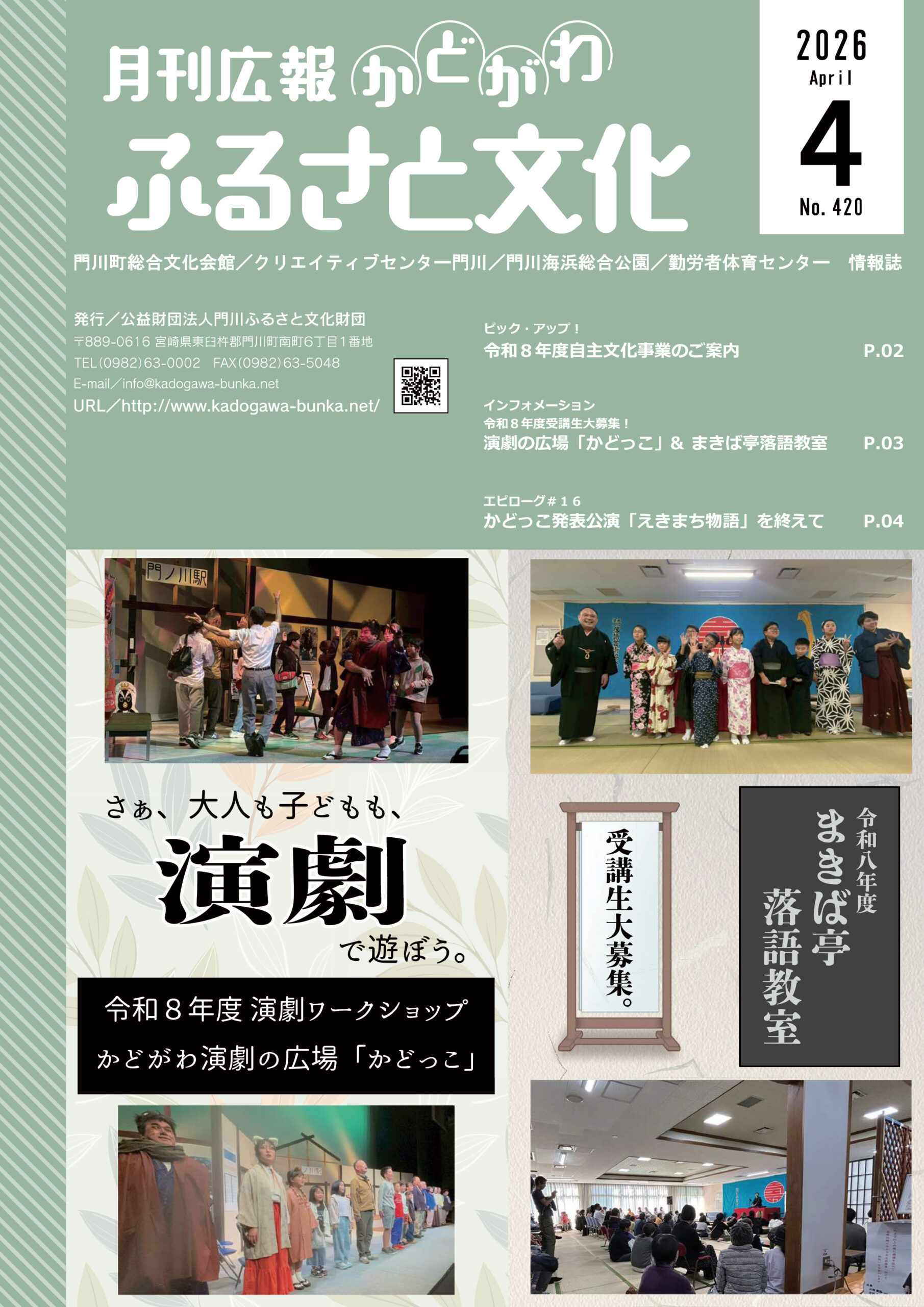 広報「ふるさと文化」4月号を発行しました。今月号は令和8年度自主文化事業ラインナップのご紹介と、令和8年度「かどがわ演劇の広場かどっこ」「まきば亭落語教室」受講生募集のご案内です。広報「ふるさと文化」は門川町内の各ご家庭に配布。その他、日向市・延岡市の図書館や行政窓口などに置いております。どうぞお手にとってご覧ください。